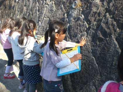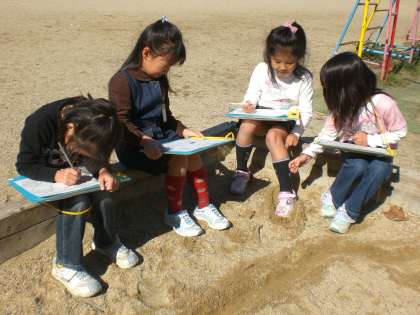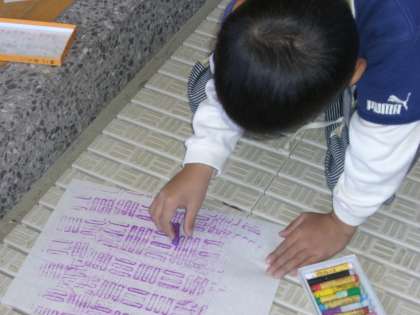 今日の図工は,身近にあるいろいろなもの(お手玉,クッション,プチプチ,スーパーボール,石垣,校庭にある遊具など)に触れ,その感触の違いを言葉に表したり、自分の選んだ凹凸のあるものを,クレヨンで紙に写し取ったりしたあと,みんなで交流しました。