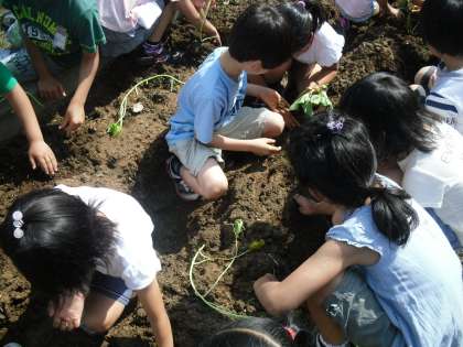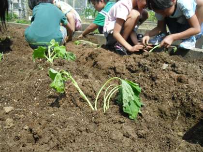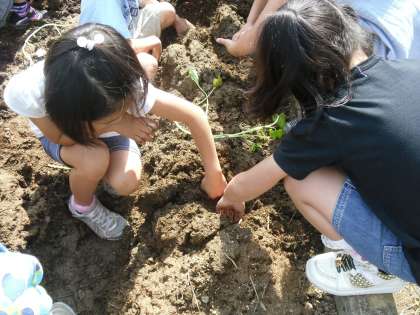 子たちはさつまいものできかたに興味津々。手を泥だらけにして土を掘り、苗を大切そうに植えていました。秋にたくさんのさつまいもでパーティができるといいですね。