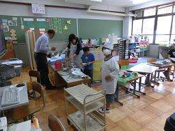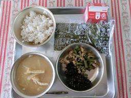 今日の給食のメインは梅ひじきのセルフおにぎりです。海苔で巻いて,いただきます。豚肉と三度豆の炒め煮もおにぎりに良く合う和風の味付けです。掲示板にある献立が大型テレビに映っているので,お手本にして当番さんが配ぜんしています。