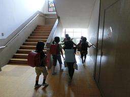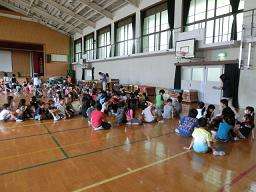 6月には毎年台風を想定した避難訓練を行っています。今日は,京都府南部に暴風警報が発令された想定で,各町別の教室に子どもたちが下校準備をして集まりました。学校待機・学童・町別移動等の確認をしてから,待機児童は体育館に集まる練習をしました。最後は,普段の下校町別児童会の教室に戻り,先生に引率されて集団下校をしました。1月には,地震を想定した下校・引渡し訓練を予定しています。