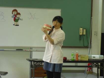 前半は歯をじょうぶにする食べ物の話や虫歯のできる仕組みについて、楽しくわかりやすいお話をしてくださいました。