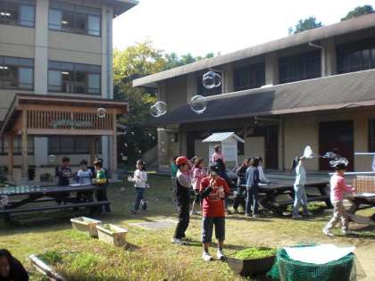 中間休みは、中庭で恒例「たけのこのシャボン玉屋さん」が開かれました。たけのこ学級で作った、特製シャボン玉液はひみつがあって、すばらしく大きなシャボン玉が飛ばせます。今日は3年の番で、みんなジャンボシャボン玉に大喜びです!