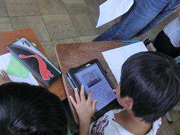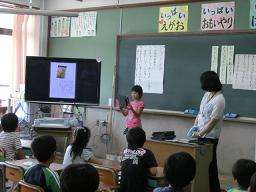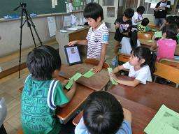 7月2日の火曜日に伏見中支部教育メディア主任研修会を藤城小で行いました。提案授業では,2年国語「お話の国の友だちをしょうかいしよう」の単元で,絵本を選んで書いた紹介文をiPadを使って伝え合う活動を参観してもらいました。画像をタブレット端末にあるワークシートに貼り付けて,紹介文はペンタブで書き込んでいます。2年生の子どもたちは,予想以上に早くタブレットの操作に慣れて使うことができていました。