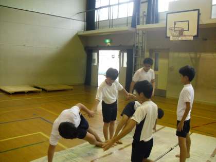 運動会まであと3週間となり,組体操の練習が本格的に始まりました。今日は,2人技,3人技の練習をしました。友達とサポートをしあって,頑張っています。