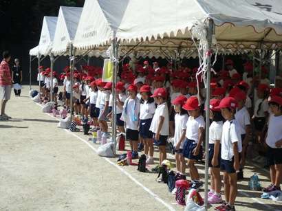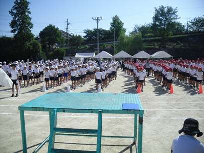 全校練習が始まりました。音楽係の演奏に合わせて赤組と白組が入場行進して開会式の場所に整列します。今年の応援席は,学区民運動会のテントを使わせていただき全員テントの中になりました。