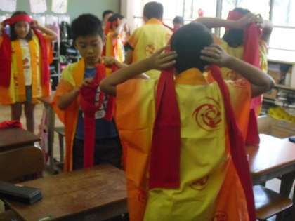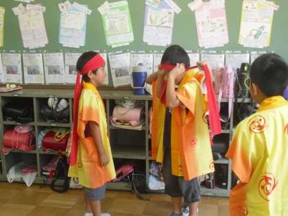 今日はついに,運動会で着るハッピとハチマキを配りました。初めてハッピの袖を通した子ども達は,大喜びです。友達と「似合うね!」と言い合って,嬉しそうな姿が見られました。5・6時間目の体育では,本番と同じようにこの格好で練習しました。いつもより踊りに気合いが入ります。運動会まで残りわずかです。素敵な演技が見せられるよう,最後まで気を引き締めて頑張りましょう。