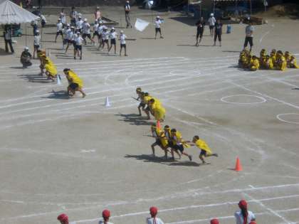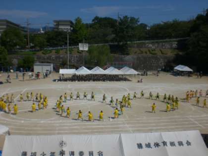 3年生の団体競技「祭りだ!〜勝利の渦を巻きおこせ!〜」です。ダンスを披露した後,「台風の目」がスタートしました。1回戦の後,作戦タイムがあり,2回戦を行います。作戦を立てた効果はあったでしょうか。