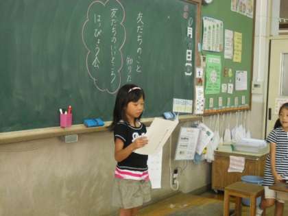 2年生の国語で「友だちのこと知りたいな」という単元を学習しています。今日は1クラスで最後の発表会をしました。友だちのがんばっていることや得意なことなど、インタビューしたり、自分で観察したりして「友だちのいいところ情報」をたくさん集め、最後に紹介文を書きました。紹介されていた友だちは、恥ずかしそうに、でも嬉しそうに発表を聞いていました。友だちのことをもっと知れる、すてきな学習ができました。