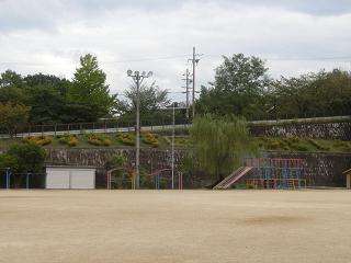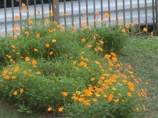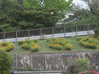 運動場スロープ「すきですふじしろ」の文字が,きれいな黄色で浮かび上がっています。3連休の間に,キバナコスモスがたくさんの花を咲かせて,とてもきれいです。