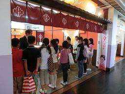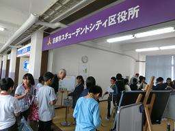 台風の影響で実施が心配された5年のスチューデントシティ学習ですが,暴風警報が出なかったため,小雨の中を早朝に出発しました。府庁前のスチューデントシティに到着し,いっしょに学ぶ明徳小学校のお友だちに挨拶して,指導の先生から説明を受けました。いよいよそれぞれのお店や区役所のブースに分かれて,大人として働く1日が始まりました。