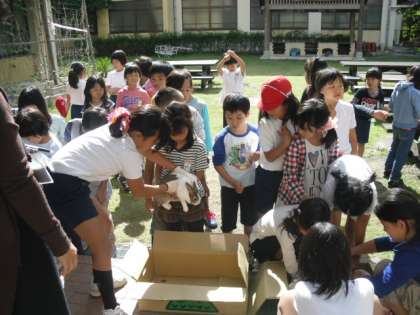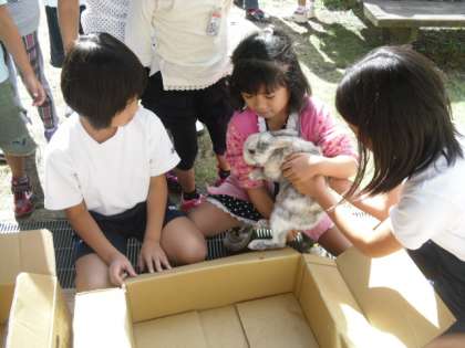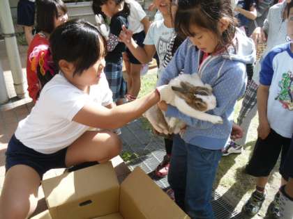 今日は飼育委員さんが企画してくれた、うさぎと「ふれあい週間」の2年生の日でした。順番にうさぎを抱っこしたり、なでなでしてあげたりしました。「かわいい!」「ふわふわ!」「飼いたい!」など、たくさんの声が聞こえてきました。普段は小屋の中にいるうさぎ3匹、ピートとチョコとあずきは、ちょっとびっくりした様子でしたが、おとなしく2年生に抱っこされていました。動物と直接触れ合えるってステキですね。