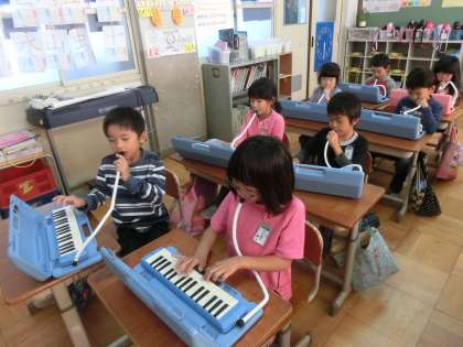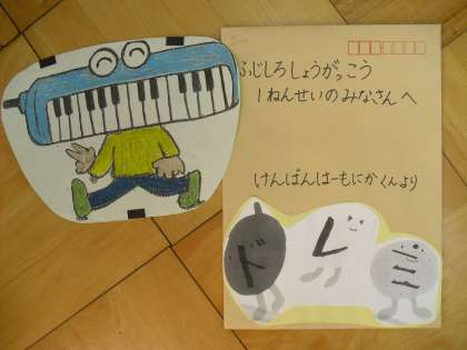 今朝、1年生の各クラスになんと『けんばんハーモニカ君』のお手紙が届きました。お手紙の中には、演奏する時の約束、息の吹き方、片づけ方などこれからの学習の中で大切なことを子ども達に教えてくれる内容が書かれていて、一つ一つみんなで確かめながら進めていきました。その後は、音しらべをして高い音や低い音を出してみたり、身近な音を真似してみたりしながら、楽しく学習のスタートをきることができました。まほうのことば「トゥ」をしっかりと身につけて、色々な演奏を楽しめるようになりたいです!