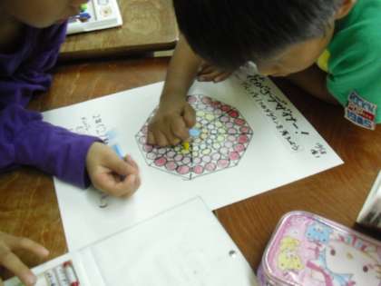 先生たちが「わっしょいわっしょい!」と踊りながら登場したからでしょうか?!子どもたちのテンションは一気に上がり、その後はグループで話し合いながら真剣にデザインを考えていました。