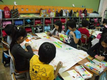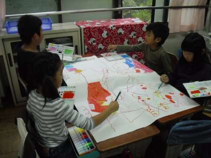 波線、太い線、細い線、ぐるぐる巻き、追いかけっこする線。模造紙の上にいろいろな線が現れました。