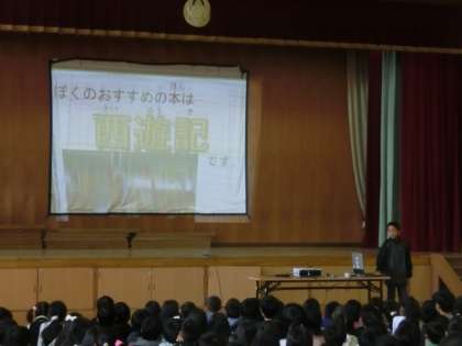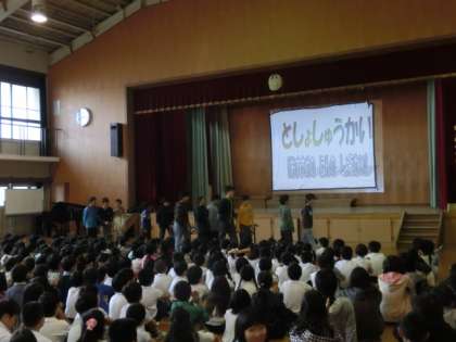 11月の集会はまず,図書委員会からです。おすすめの本の紹介を委員さんがプレゼンしてくれました。いろいろなジャンルの本が紹介されました。きっとみんなのお気に入りが見つかるとおもいます。