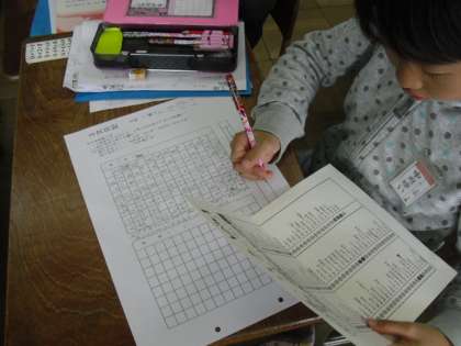 2年生は、週に2日、そうじの後のチャレンジタイムに3文日記を書いています。「はじめ・中・おわり」の三文にわけて書く練習をしています。様子や気持ちを表すことばを増やすために、言葉カードも見ながらがんばって書いています。短い文の中で、様子や気持ちを表す言葉をぴたりと当てはめて使うのは難しいですが、いま練習真っ最中です。