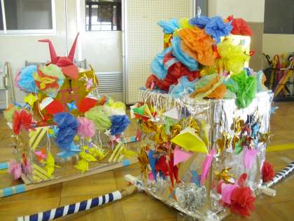 今日の4時間目に「なかよしまつり」のあと片づけをしました。残念ながら,壊れてしまつた花がさはきれいに片づけ,残っているみこしと花がさは,生活科ルームに来年の2年生のために置くことにしました。子どもたちは短い時間であっという間にきれいにし,そうじまで一生懸命がんばっていました。