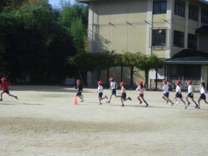 今日の体育では、持久走となわとびを交代でやりました。持久走では、スタートからゴールまで同じペースで走ることを目標に頑張りました。5分間で何周走れたかを数えながら、立ち止まらずに走っていました。最初は寒がっていた子どもたちも、ゴールの後は、「暑い!」とつぶやいてました。