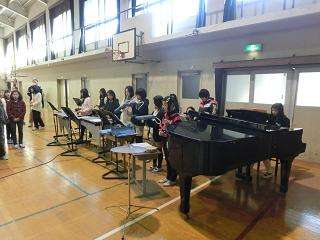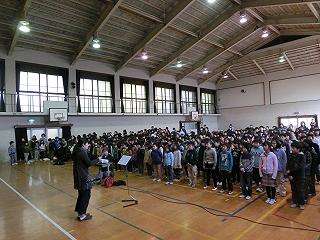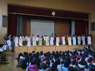 最後にみんなで練習してきた「手のひらをかざして」の歌を,音楽委員会の伴奏で合唱しました。『てのひらを ひかるそらに かざしてごらん ぼくも きみも いきているあかしが みえる・・・』すてきなハーモニーの歌声が響きました。