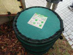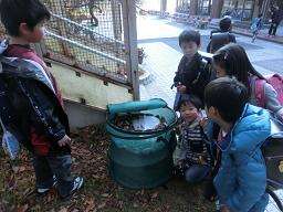 落ち葉で堆肥を作る簡易のガーデンパックを,校門横と体育館横に置いています。第3グランドには大きなコンポートがありますが,小型でも同じように堆肥ができるそうです。落ち葉を手で集めて入れることができるので,子どもたちは興味シンシンで覗き込んでいます。