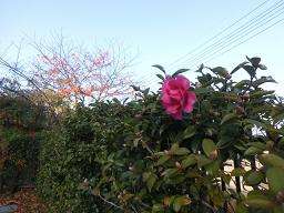 少し開花の遅れていた道路沿いのサザンカ並木の花も咲き始めました。こちらの花は,少し濃い色です。これから北風の吹く中で,紅い花で冬枯れの景色を明るくしてくれます。