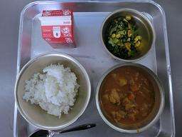 今日の給食献立は,みんなに大人気のカレーです。ふだんのビーフカレーではなく,チキンカレーでした。色は少し薄めの黄色で,スパイスの効いたインド。小松菜のいためものといっしょにおいしくいただきました。