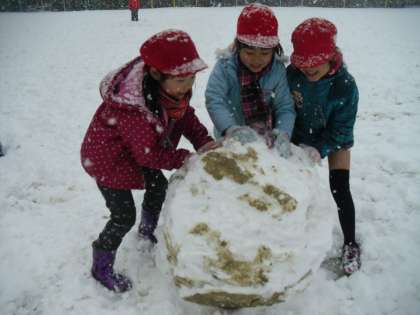 藤城小学校の運動場は一面真っ白。1年生全員で雪遊びをしました。