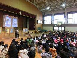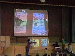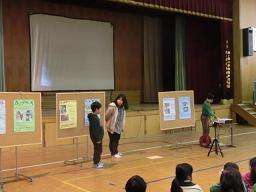 今日は体育館で,たけのこ学級の「かめのこタイム」の発表会です。生活科「たけのこのおかしやさん」で取り組んだおかしのレシピを紹介しました。チョコクッキーやカップケーキの絵や写真のプレゼンを全校のみんなに見てもらいました。「おいしそうですね。私も作ってみたいです・・」などの感想がたくさん出ました。初めの言葉や司会も然りとできて,すてきな発表会になりました。