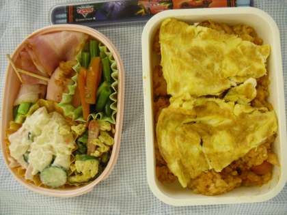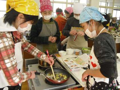 今日は,6年1組がお弁当をつくりました。どのグループも,おいしいおかずを協力して完成させることができました。天津飯やオムライスなど,ご飯もいろいろに工夫していて感心しました。中学生になったら,家庭科で学習したことを生かし,自分でお弁当を作ったり,家の仕事をしたりして,お家の人の力になってほしいと思います。最後に楽しい調理実習ができてよかったです!