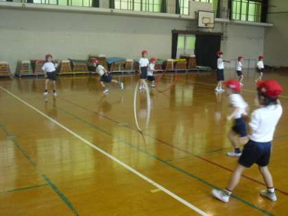 体育では「ようぐあそび」の学習が始まりました。一回目の今日は,フラフープを使った学習です。体のいろいろな部分を使って回したり,ペアになって転がしたりしました。ペアで投げたり受けたりするのは,なかなかまっすぐに転がらずに,フラフープを追って走っていく姿も見られましだが,少しずつ上手になってきました。これからは棒やボールを使った学習もしていきたいと思います。