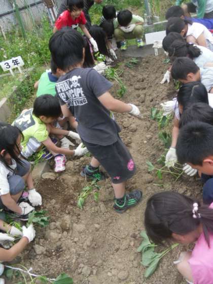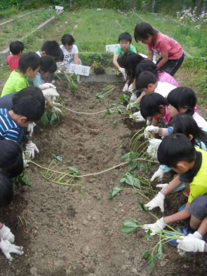 生活科の時間に、サツマイモの苗を植えました。班ごとに分かれ、2人に1本ずつ植えました。新芽は埋まらないように、根が生えるところにしっかり土をかけていきました。「秋に実るのが楽しみ!」「早く食べたい!」との声が聞かれました。