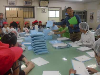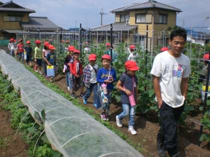 今回は、中でどんな人たちが働いているのかや、どんなものや場所があるかについて調べました。畑にはキュウリやなす、とうがらしやサニーレタスなどたくさんの種類の野菜が育ててあり、子どもたちは見つけるたびにとても嬉しそうでした。ほかに、箱を作っておられる作業所も案内していただき、一生懸命働いておられる作業所の人たちの姿を見させていただきました。