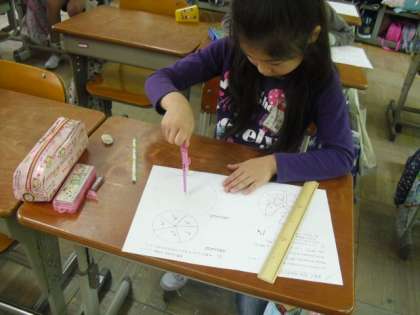 子ども達が楽しみにしていた「コンパス」の学習が始まりました。一日目は、まずコンパスを使わずに「まるい形をかく」という活動に取り組みました。そして今日はコンパスを使って円をかいてみました。中心に針をしっかりとさして、つまみをくるりと回すという作業が思いのほかむずかしかったようで、「先生、けっこうむずかしいわ。」という声も上がっているほどでした。でもそんな中できれいな円がかけた子ども達は思わずにっこりでした。習うより慣れろです。何回も何回も実際に使って上手になっていきましょう。