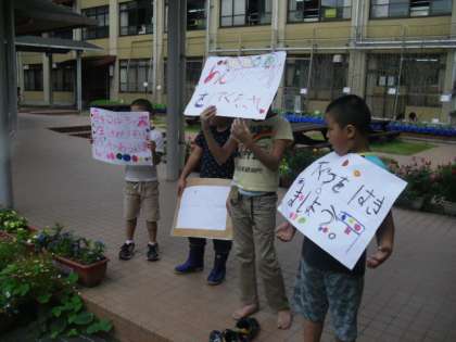 シャボン玉やさんは、たけのこ学級の4人にとっては、大切な学習です。準備から始まり、みんなの前でシャボン玉で遊ぶときの注意を話し、後片付け、そして、うまくできたかどうか反省して、次の活動に活かしていきます。6年生に、「シャボン玉やさんは、たけのこ学級の子供にとって、とっても大事な学習なんだよ。」というと、「へ、そうなんだ。知らなかった。」という声が返ってきました。これからも、学校のみんなに啓蒙していきたいと思います。