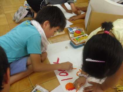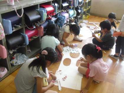 校区探検の4グループから、さらに発表の方法別に分かれ、ペープサートや劇などの準備に取り組みました。