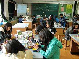 理科の学習もまとめの時期です。電磁石の実験が進んで、いよいよ電磁石で動くロボットの製作にかかっています。理科支援員の先生もいっしょに、難しいところを教えてもらいながら、細かい作業に取り組んでいます。