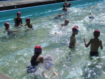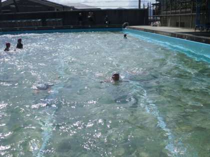 このところのぐずついたお天気がうそのように晴れ渡った夏空の下で、中学年の最後のプールがありました。今日は検定の日だったこともあり、検定をめあてに参加した子ども達もいました。