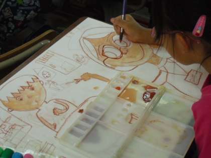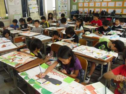 図工は「お話の絵」に取り組んでいます。「一番心に残った場面が見る人に伝わるように」をめあてにがんばっています。色使いを工夫しながら、ていねいに描き進めています。完成が楽しみです。