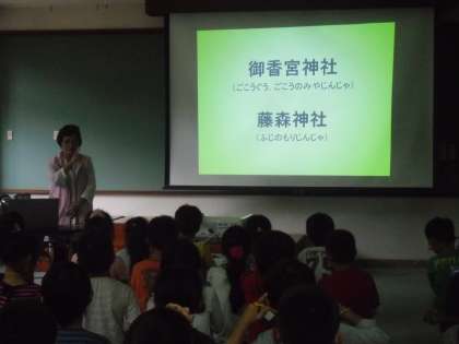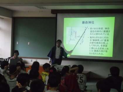 昨日の生活科の時間に、ゲストティーチャーをお迎えして、藤森祭や御香宮、御神輿のことについて詳しいお話を聞きました。