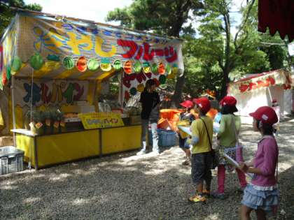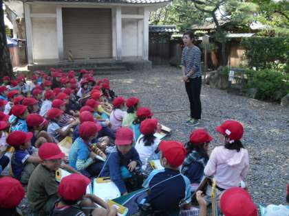 1年生は、生活科「なかよしまつり」で、2年生に楽しんでもらえるためのお店を出します。そのために、どんなお店があるのか・看板のデザインや使っている道具などを調べに御香宮のおまつりの様子を見に行くことにしました。