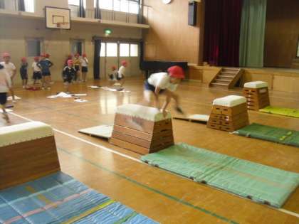 今週から体育は、とびばこあそびに入りました。3年生の目標は「開きゃくとび」「かかえこみとび」「台上前転」の三つの技です。