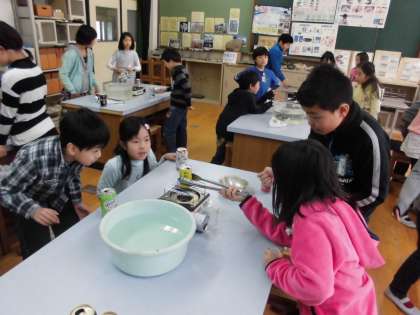 理科の学習で「すがたをかえる水」の学習が始まりました。今日は,最初の時間ということで,ご家庭で準備していただいたアルミ缶を使って実験をしました。子どもたちも大喜びで興味津々に実験に見入っていました。
