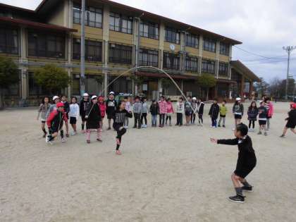 交流給食に引き続き,今日,大なわ集会に向けての練習を2年生といっしょにしました。4年生が見本になって大なわ集会に向けても引っ張っていってもらいたいです。