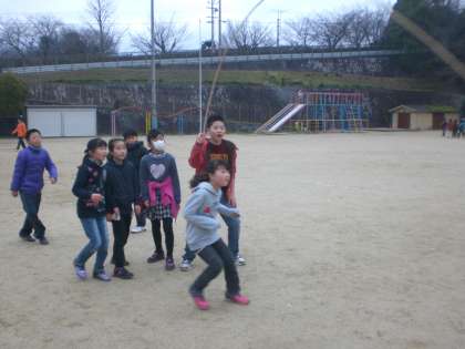 運動能力のちがう異学年と同じ競技を楽しむことは難しいものです。縄を回す速度を変えたり,跳び方を教えたり。高学年として様々なことに気を使う、貴重な体験ができました。