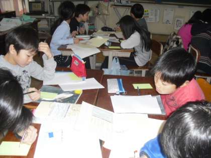 今回の交流では,友達の意見文を読み,工夫しているところを話し合ったり,次の2組との交流に向けての修正をしていました。