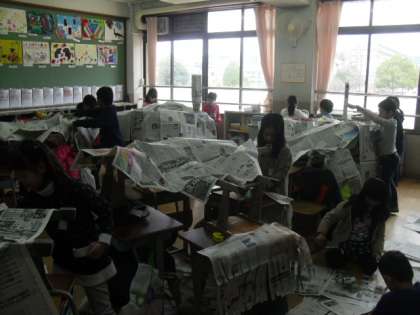 今日の図工の学習では、新聞紙を使ってひみつきちを作りました。