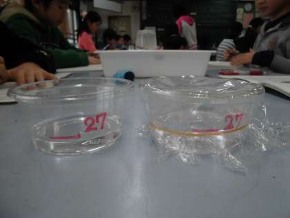理科の学習で水についての学習をしています。今日は,水面から水が水蒸気にかわって出ていく「蒸発」についての学習をしました。子どもたちは真剣な眼差しで観察や記録をしていました。