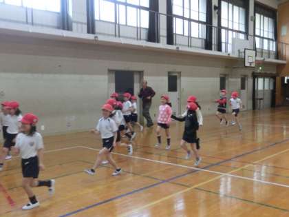 体ほぐしの運動ということで,体育館を大きく走ったり,スキップしたりしてまずは準備運動。