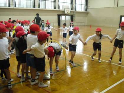 次に,フラフープを使って,手をつないだまま端から端まで通り抜けられるか挑戦しました。「もうちょっと!」と声をかけながら頑張っていました。