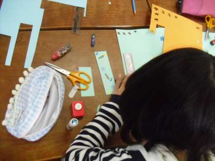 1年生を迎える会でプレゼントするしおり作りを行いました。いろいろな型抜きを使い,上手に組み合わせて作成することができました。喜んでもらえるといいですね。